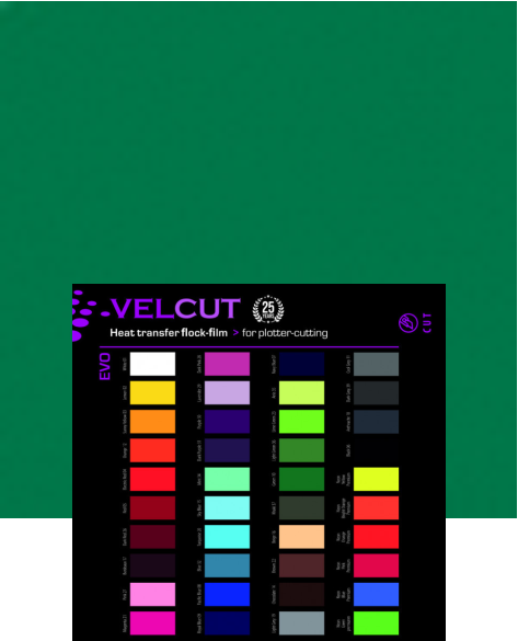 Sef VelCut Evo ist eine hochwertige beflockte Schmelzfolie auf Basis von Viskosefasern (Premium-Neonfarben auf Basis von Polyamidfasern). Aufgrund einer weichen, samtartigen Haptik sowie einer ausgezeichneten Farbbrillanz entsteht eine hohe Image-Qualität. Die Folie lässt sich konturenscharf schneiden und ist auch bei zügigem Abzug des Restgitters ohne Materialabriss problemlos zu entgittern. Die Flockfolie dient zur Beschriftung von Textilien wie Sport-, Freizeit- und Arbeitskleidung sowie von Trägerstoffen für den Bereich Werbung und Design. Der Flock überzeugt durch eine ausgezeichnete Waschbeständigkeit.
