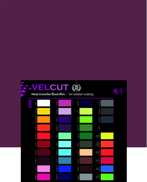 Sef VelCut Evo ist eine hochwertige beflockte Schmelzfolie auf Basis von Viskosefasern (Premium-Neonfarben auf Basis von Polyamidfasern). Aufgrund einer weichen, samtartigen Haptik sowie einer ausgezeichneten Farbbrillanz entsteht eine hohe Image-Qualität. Die Folie lässt sich konturenscharf schneiden und ist auch bei zügigem Abzug des Restgitters ohne Materialabriss problemlos zu entgittern. Die Flockfolie dient zur Beschriftung von Textilien wie Sport-, Freizeit- und Arbeitskleidung sowie von Trägerstoffen für den Bereich Werbung und Design. Der Flock überzeugt durch eine ausgezeichnete Waschbeständigkeit.