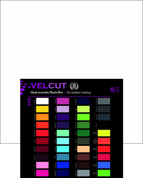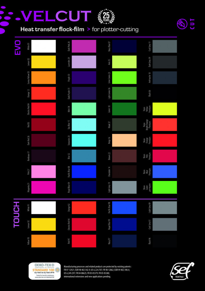 Sef VelCut Evo ist eine hochwertige beflockte Schmelzfolie auf Basis von Viskosefasern (Premium-Neonfarben auf Basis von Polyamidfasern). Aufgrund einer weichen, samtartigen Haptik sowie einer ausgezeichneten Farbbrillanz entsteht eine hohe Image-Qualität. Die Folie lässt sich konturenscharf schneiden und ist auch bei zügigem Abzug des Restgitters ohne Materialabriss problemlos zu entgittern. Die Flockfolie dient zur Beschriftung von Textilien wie Sport-, Freizeit- und Arbeitskleidung sowie von Trägerstoffen für den Bereich Werbung und Design. Der Flock überzeugt durch eine ausgezeichnete Waschbeständigkeit.
